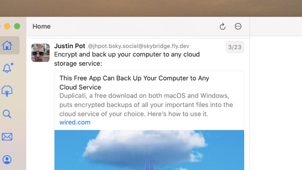 It should be noted that not every Bluesky feature is supported. And not every feature in your Mastodon client is going to work—I couldn't browse the most shared news articles in Mona, for example. But the basics—your timeline and replies—work very well. I mostly recommend this if you, like me, are already active on Mastodon and have a client of choice. Settings this up means I can manage conversations with both Mastodon and Bluesky users in one application, which I like.